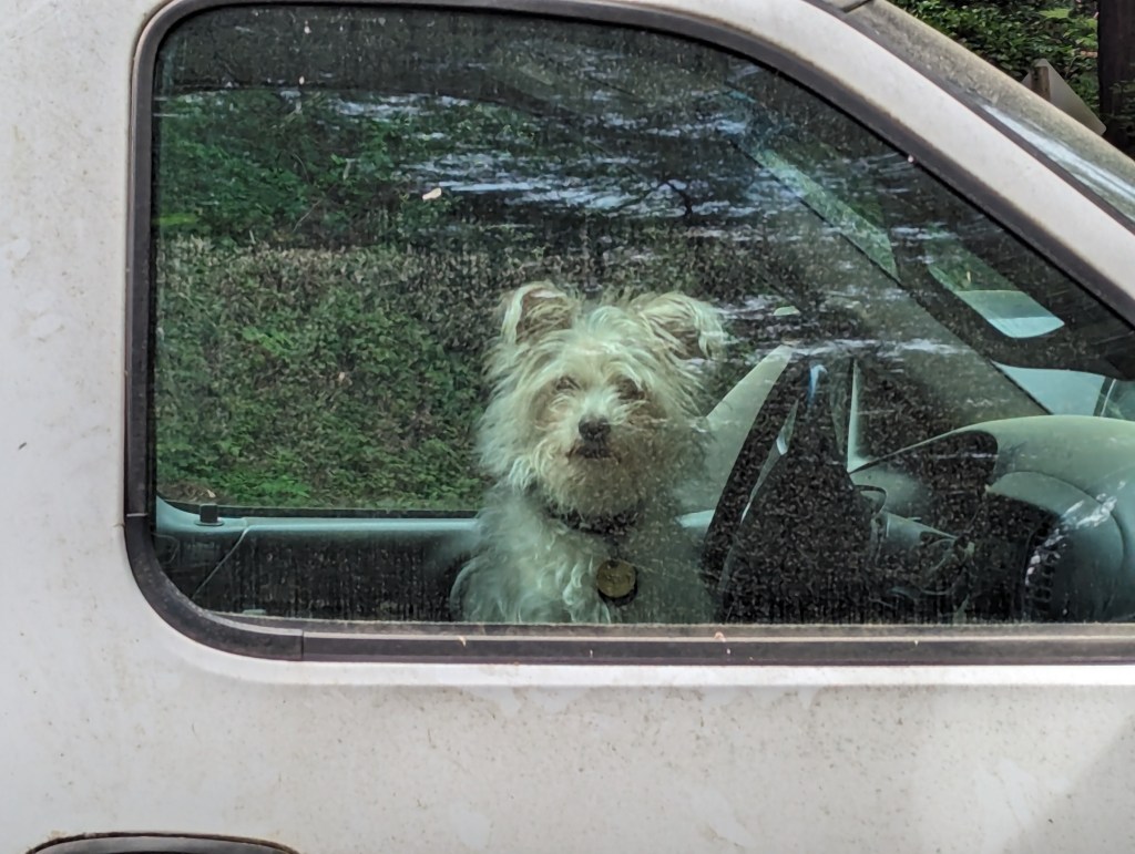 This is my first Sunday without writing anything more than this brief explanation about why I wrote nothing more than this brief explanation, . . . and why Rhody looks rather damp and concerned. A tornado landed less than two miles away, in Scotts Valley, just a moment before I got this picture. He knows about Toto of Kansas.