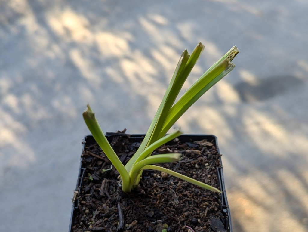 5. Musa acuminata ‘Golden Rhino Horn’ banana pups have grown like weeds since their arrival last June, and now, one of this pair is generating either another pair of pups very closely together, or a single pup that is already extending its first frond away from its tip.