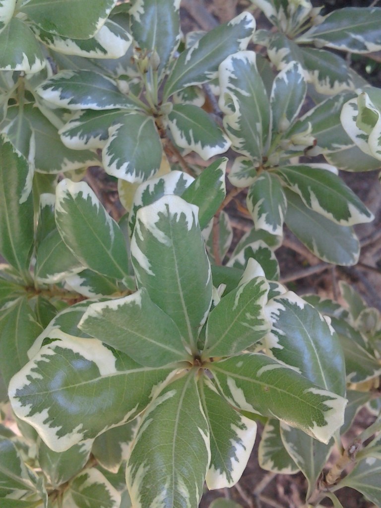 There are too many other plants known as ‘mock orange’ for Pittosporum tobira to still go by that name, which is why it is more commonly known by its Latin name, or simply as ‘tobira’. The pleasantly fragrant flowers do not smell too much like those of orange anyway. The glossy and dark green leaves are like those of some hollies, without the distinctive prickly points. ‘Variegata’ has lighter green foliage variegated with white, but does not bloom as much. Dwarf cultivars, both variegated and unvariegatd, bloom even less. ‘Variegata’ has a tendency to occasionally produce stems of green (unvariegated) foliage that grow more vigorously and can overwhelm the original variegated growth if not pruned out. Common green Pittosporum tobira can grow as a small tree in the partial shade of larger trees, but is more often maintained as dense shrubbery less than ten feet tall. It makes a nice dense hedge in full sun, but unfortunately does not bloom if shorn regularly. All cultivars are resilient to drought once established.