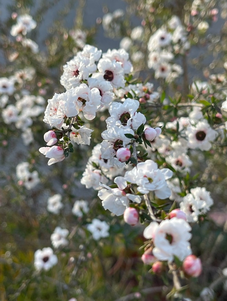 Bloom should probably be most profuse for late spring or early summer. In actuality, New Zealand tea tree, Leptospermum scoparium, blooms whenever and however it wants to. Now that it seems to be blooming prematurely, it might continue to bloom in phases until autumn. Minor bloom phases might even continue randomly through autumn and winter.