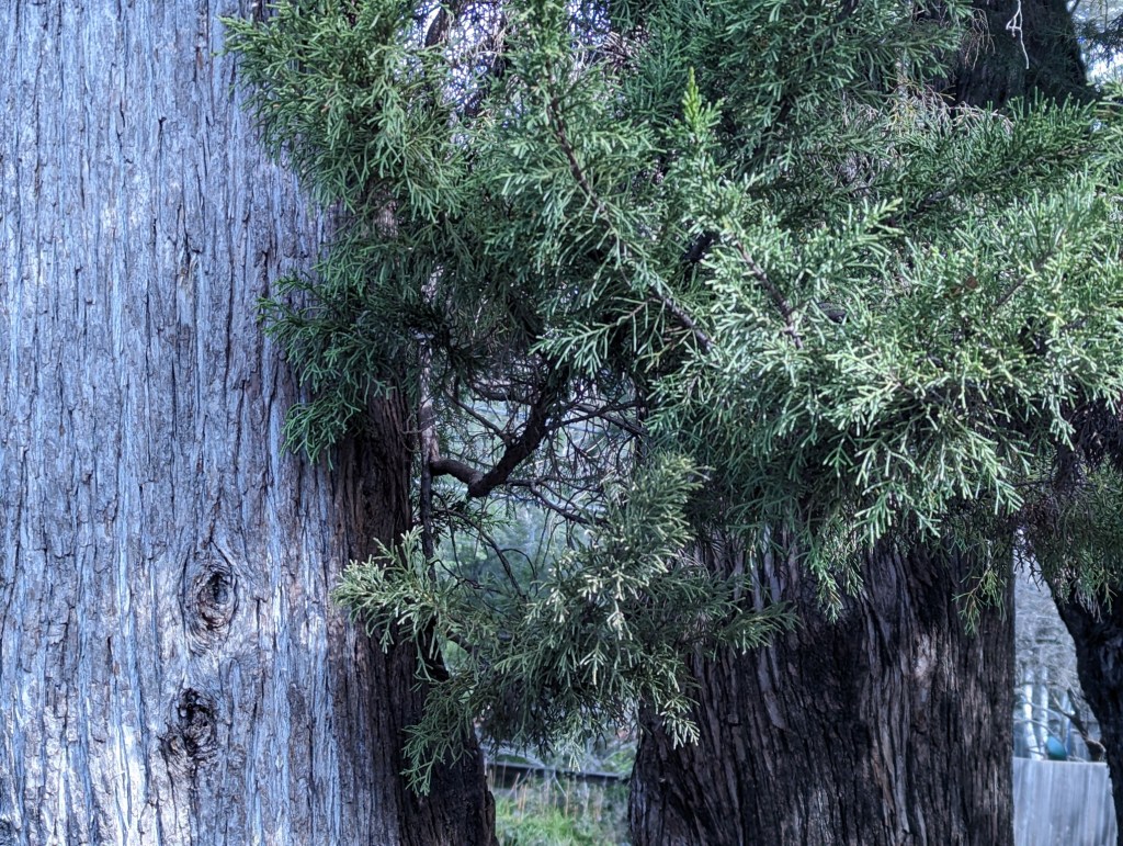 2. Cupressus macrocarpa, Monterey cypress is nothing special, but I happen to be fond of its foliage and bark. This is a hedge that never got hedged, but grew as crowded trees.