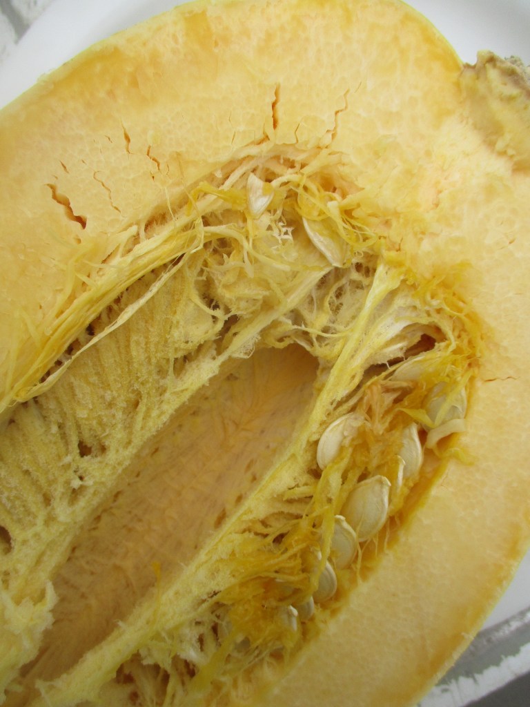 Spaghetti squash fruits resemble melons. Most types get about four inches wide and eight inches long. Color ranges through creamy white, pale tan, yellow and golden orange. Fruits with pale color tend to have milder flavor. After cooking, the otherwise solid flesh pulls apart into squiggly bits that resemble spaghetti. The big seeds within may not be true to type. Related squash hybridize freely, particularly with zucchini.