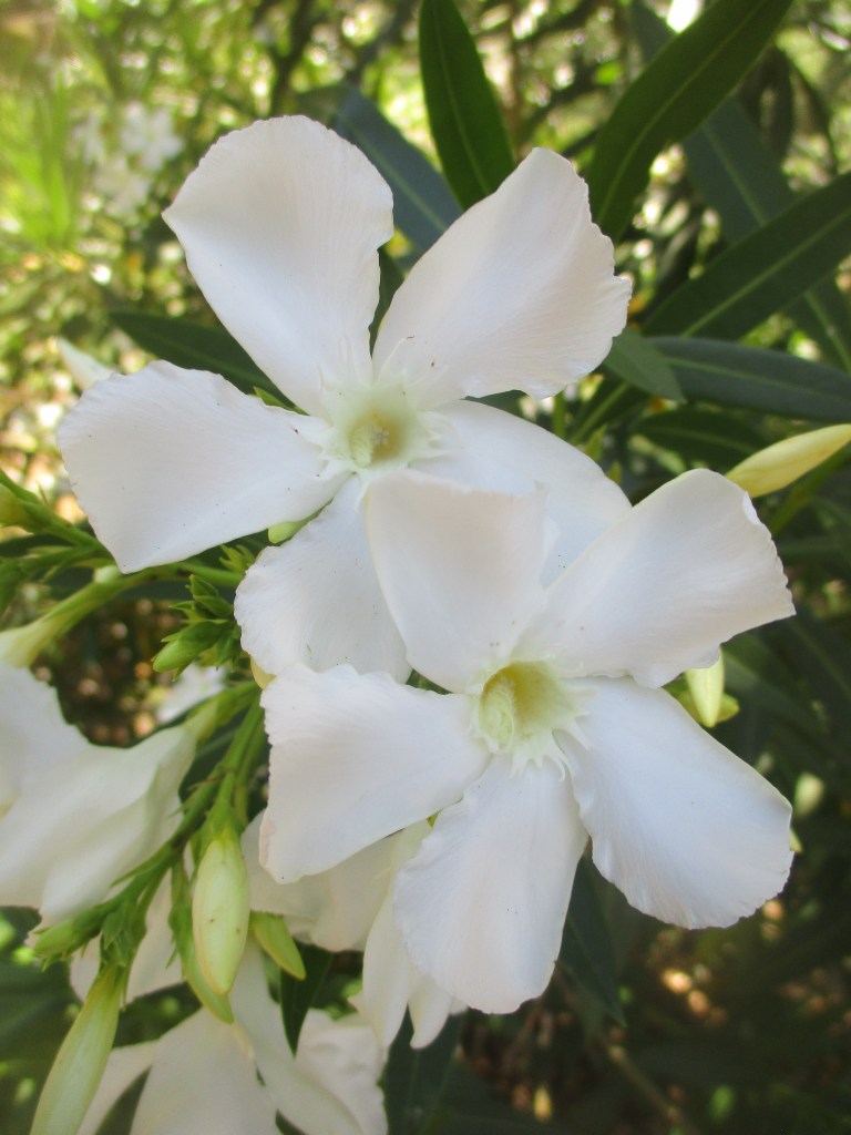 The biggest oleander get as tall as fifteen feet, so can be pruned up as small trees, either on single trunks or multiple trunks. However, because their limber trunks can not support much weight, occasional pruning is necessary while trunks develop. Such pruning limits bloom, so should happen mostly at the end of winter. Straight single trunks need staking. Oleander wants warm and sunny exposure, but is quite undemanding.