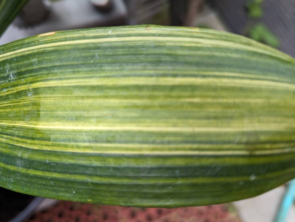 Furcraea foetida ‘Mediopicta’ is not quite as tough as unvariegated (green) furcraeas, so it can be damaged both by frost or harsh exposure to sunlight. It is also a bit smaller, staying less than five feet tall (prior to bloom of course) and seven feet wide. Too much watering can cause rot.