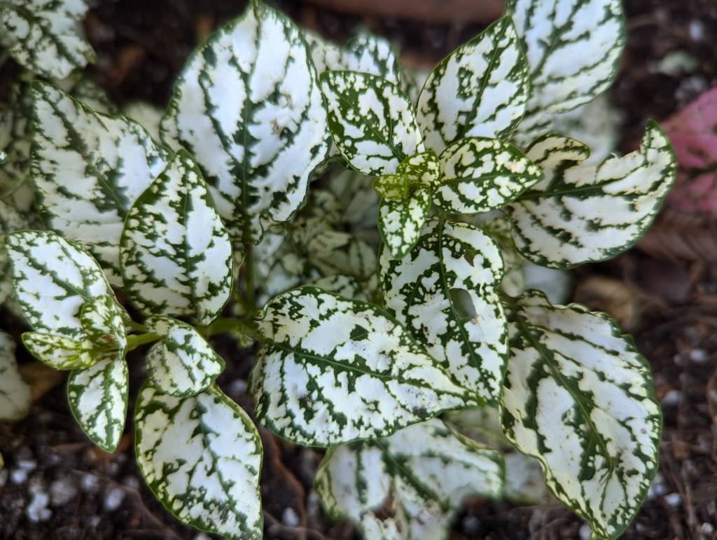 3. Hypoestes phyllostachya, polka dot plant variegation is variable. Some specimens are more green than others. At least two of the pink sort are variegated with red such as this.