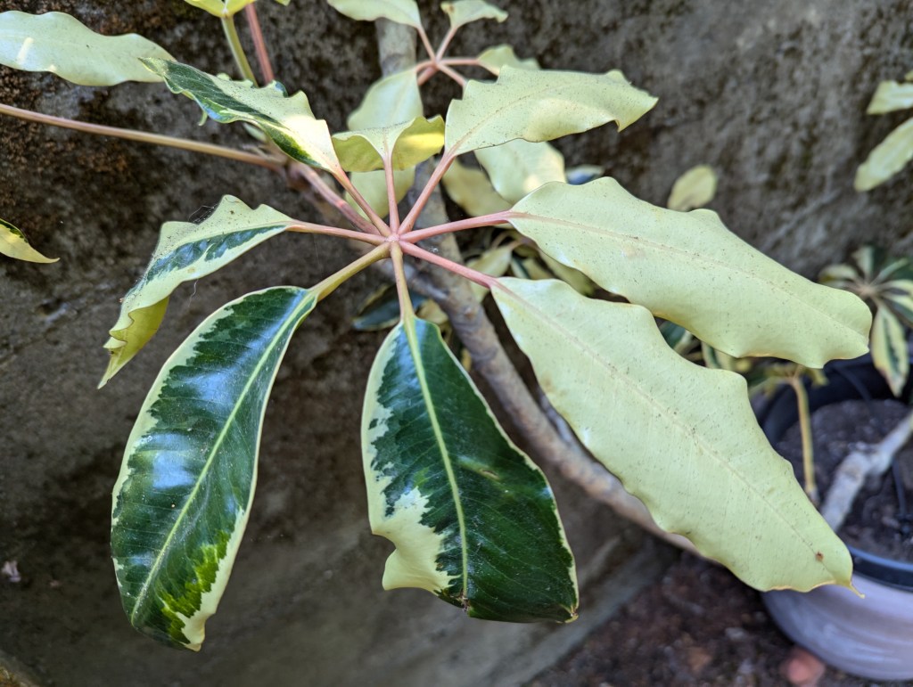 5. Tupidanthus calyptratus ‘Variegata’, mallet flower was not planned. I have wanted to grow the typical unvariegated type since I met it in 1986. Brent sent me this raggedy old but rare variegated specimen so that I would grow more for him. I am learning to like it.